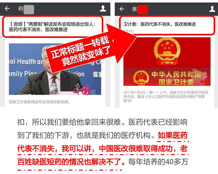 最近出现了一篇标题党文章“卫计委:医药代表不消失,医改难推进”。我们暂且不说该官员讲话的基本逻辑属于本末倒置、推卸责任,就微信文章编辑人员本身来说,根本就是对该处长讲话的“断章取义”,并以标题来“哗众取宠”,有失“厚道”。再说了,这只能说明现在官员“口无遮拦”,把最基层的人员,拿出来当医改推进难的“挡箭牌”。